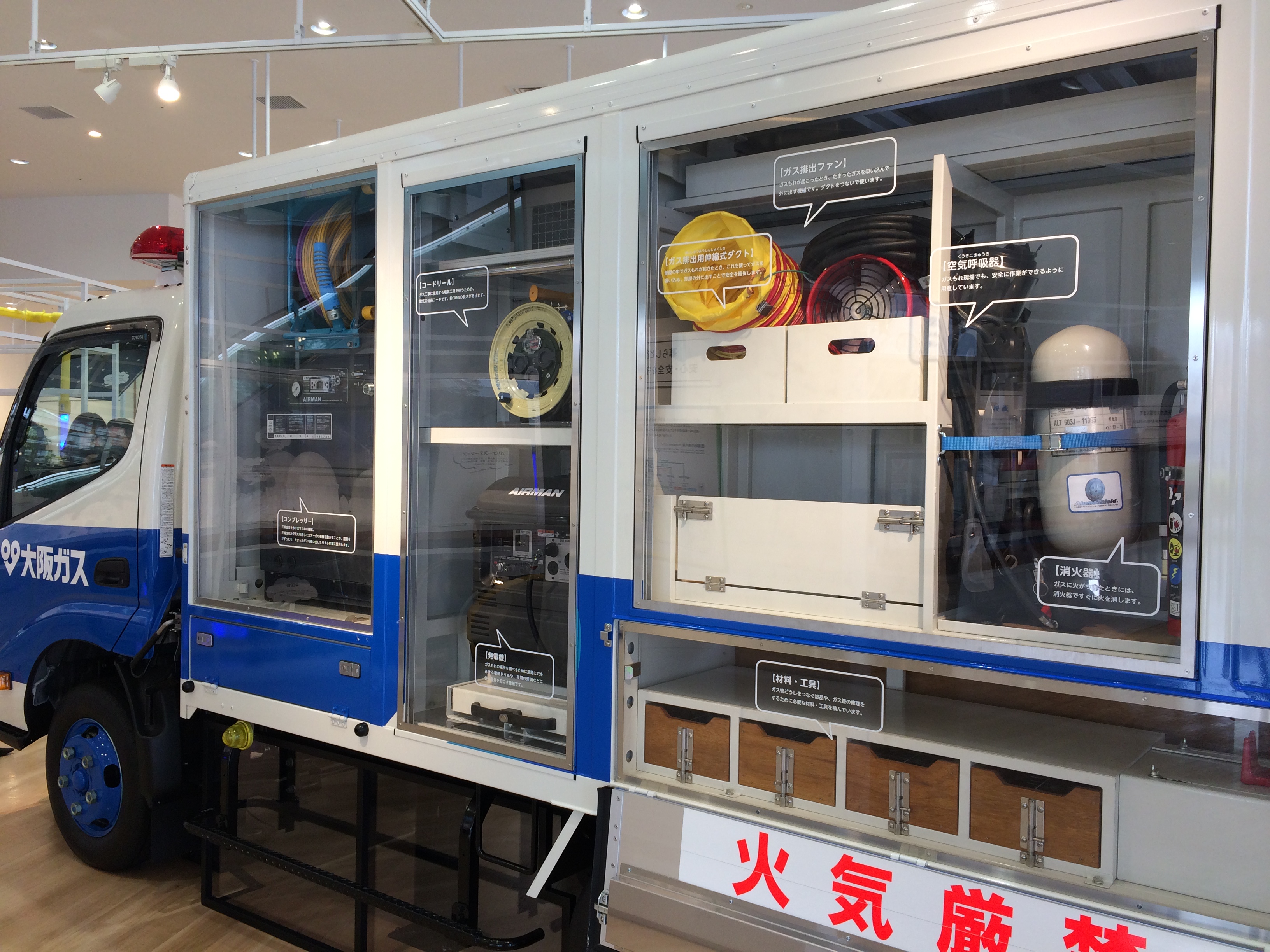 1階の「エネルギーギャラリー」では天然ガスが送られてくる仕組みを学べたり、緊急車両への乗車体験ができます。