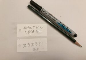 1.鉛筆&油性ペンで書いてみた後、水に濡らす