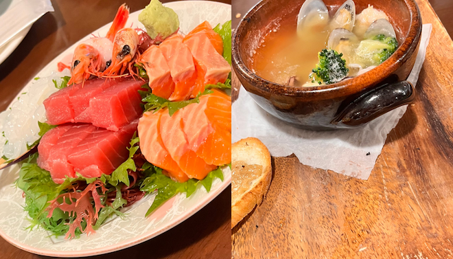 いわきは海鮮物がおいしいということで、お刺身やアヒージョをいただきました。