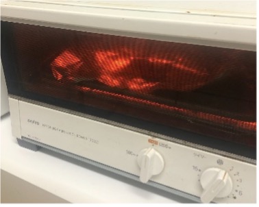 ② ミルクチョコレートの方を、1,200Wのオーブントースターで2分間焼き上げます。