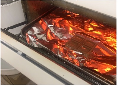 浴室の温度は大体25度が平均であり、20度よりもだいぶ高いため、チョコレートの外側が溶けると手が汚れてしまいます。そのため、手に触れるところは、焼きチョコにし、焼きチョコで挟んだ、中のチョコレートだけが溶けるようにします。