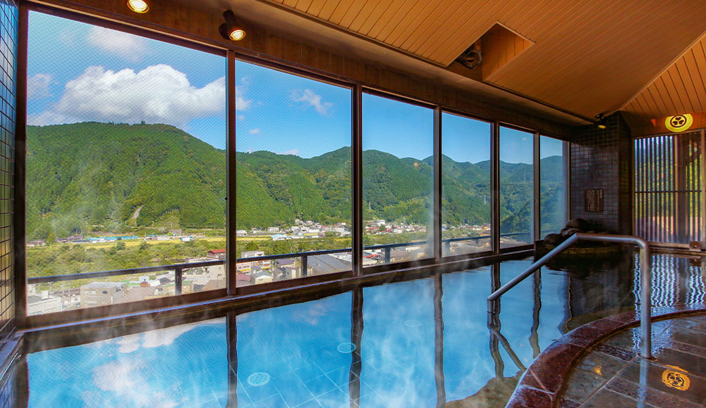 内湯は、大きな窓ガラスから山の景色が見えて開放感バツグン。